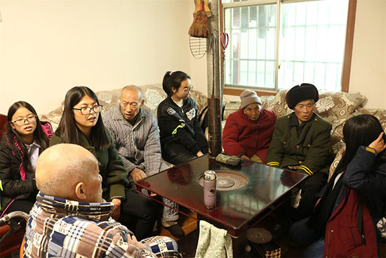 志愿者們分為清潔慰問組與炊事組兩組。清潔慰問組一部分打掃衛(wèi)生,一部分陪老人們聊天,傾聽老人們講述自己的經(jīng)歷以及與家人、孩子的故事,談話中老人們感慨現(xiàn)今生活的美好,教育志愿者們要學(xué)會珍惜。天氣晴朗,志愿者攙扶著老人在院里散步,還從室內(nèi)搬出長凳,與老人共浴溫暖的陽光。期間,老人們與志愿者情切交流,氣氛十分融洽,幾名志愿者在一位老爺爺?shù)膸ьI(lǐng)下,唱起了《東方紅》、《軍中綠花》等紅色革命歌曲。