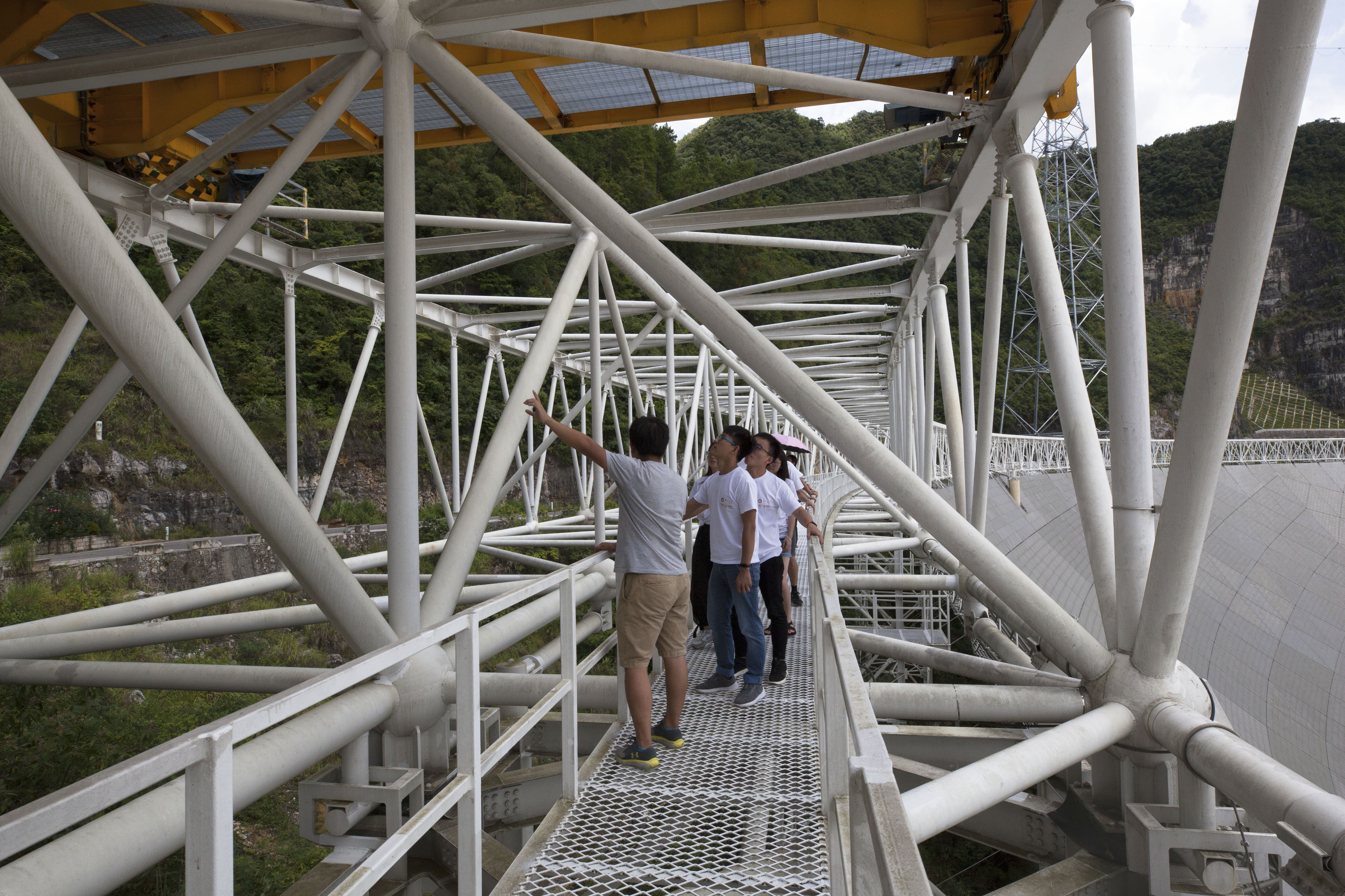 實(shí)踐隊(duì)到達(dá)天文臺(tái)辦理完入住手續(xù)后,便迅速進(jìn)入了實(shí)踐工作狀態(tài)。首先FAST負(fù)責(zé)人以短片的形式向大家介紹了FAST及其建造過(guò)程,隨后在岳昊老師的帶領(lǐng)下參觀了FAST工程現(xiàn)場(chǎng),并且有相關(guān)負(fù)責(zé)人在現(xiàn)場(chǎng)解答了同學(xué)們的疑問(wèn)。實(shí)地了解了FAST的結(jié)構(gòu)、功能及工作原理。500米口徑、25萬(wàn)平方米的反射面積、4450片反射面板、2225根拉索及促進(jìn)器,6670根主索,一個(gè)個(gè)驚人的數(shù)字,讓我們?yōu)橹鸷?。這是幾代科研人員的心血,這就是南仁東先生的“工匠精神”,這就是“天眼“精神。至此,我們向南仁東總工程師致敬,向?yàn)樘煅鄹冻鲂难墓こ處焸冎戮础?/span>