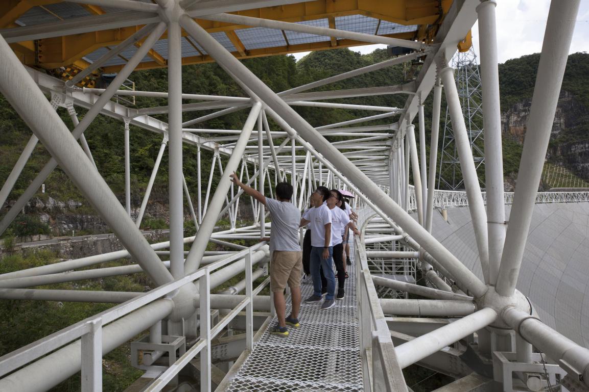 實踐初期,隊員們通過短片了解了FAST的建造發(fā)展,并在岳昊老師的帶領下前往工程現場實地了解觀摩。同學們被500米口徑、25萬平方米的反射面積所震懾,也為4450片反射面板、2225根拉索及促進器和6670根主索而瞠目。同學們深知,在宏偉背后,凝結著幾代科研人員的心血,也傾注著南仁東總工程師的“天眼”精神,而這份匠心力量正是未來科研之路上不可或缺的行業(yè)法寶。