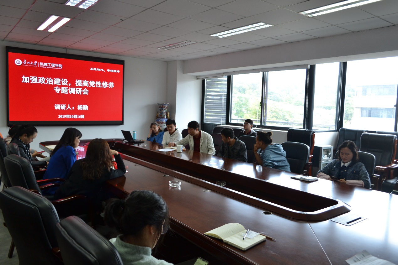 (記者 范順鑫|攝影 范順鑫 )為認(rèn)真落實(shí)中央、省委和貴州大學(xué)黨委的決策部署,扎實(shí)開展學(xué)院“不忘初心、牢記使命”主題教育工作,根據(jù)機(jī)械工程學(xué)院黨委班子成員開展主題教育調(diào)研方案,10月16日,機(jī)械工程學(xué)院副院長楊勤在機(jī)械樓518會(huì)議室召開“加強(qiáng)政治建設(shè),提高黨性修養(yǎng)”專題調(diào)研會(huì),學(xué)院黨委副書記代祥社及各支部書記、學(xué)生黨員代表、教職工黨員代表參加了會(huì)議。