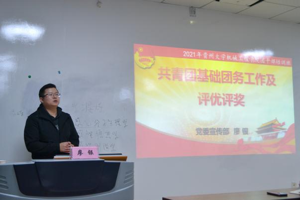機械工程學院網(wǎng)站訊(記者 徐馳|攝影 徐馳)4月14日晚七點,機械工程學院在機械樓416舉行了團干部培訓會。此次培訓會特別邀請了貴州大學校團委組織部部長廖銀老師擔任主講老師。培訓會由學生科何琳煜老師主持,學院各團支部書記、副書記、組織委員參加了此次培訓。