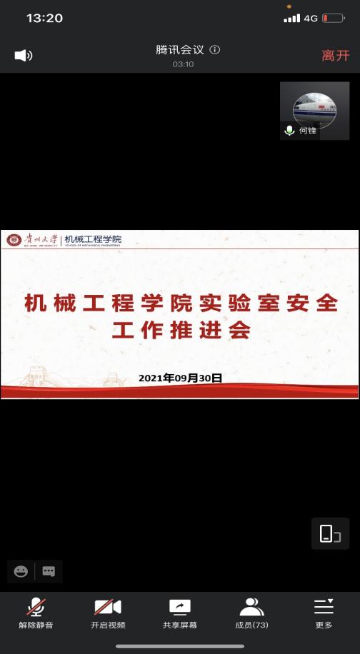 9月30日13:00,學(xué)院召開實(shí)驗(yàn)室安全工作線上專題推進(jìn)會,黨委書記安明剛、院長李少波、副書記廖燁、副院長楊勤、何鋒出席會議,學(xué)院教師參加會議,會議由安明剛主持。會上,何鋒強(qiáng)調(diào)安全是保障師生們生命以及日常學(xué)習(xí)的生活的重要前提,要進(jìn)一步提高對安全工作重要性的認(rèn)識,全院上下要樹立整體安全觀,不斷加強(qiáng)安全宣傳教育,做到人人皆知;不斷加強(qiáng)安全制度建設(shè),規(guī)范全院師生的安全行為,做到人人皆行;不斷深入開展工作,加強(qiáng)安全排查力度,對風(fēng)險(xiǎn)管控做到精準(zhǔn)識別。廖燁強(qiáng)調(diào)實(shí)驗(yàn)室安全無小事,一要提高政治站位,樹立安全穩(wěn)定是第一責(zé)任意識;二要落實(shí)責(zé)任,開展自查自排工作,消除安全隱患;三要完善制度,建立相關(guān)臺賬。李少波指出,學(xué)院要完善管理模式、提升服務(wù)能力,要層層簽訂安全責(zé)任書,安全責(zé)任落實(shí)到人,開展安全大檢查。最后,安明剛強(qiáng)調(diào)要重新審視學(xué)院安全工作,并對學(xué)院安全工作提出更高要求,一要摸清底數(shù),清楚樓層教室安排、物品存放以及物品性質(zhì),明確負(fù)責(zé)人;二要提升安全意識和責(zé)任意識,導(dǎo)師以及實(shí)驗(yàn)室管理人員要加強(qiáng)對學(xué)生和實(shí)驗(yàn)室的管理;三是強(qiáng)調(diào)國慶學(xué)生安全以及疫情防控相關(guān)要求。會后,學(xué)員班子成員對學(xué)院學(xué)生工作室、實(shí)驗(yàn)室開展安全大檢查。