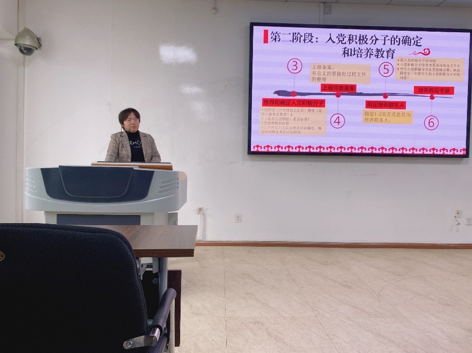 崔永霞結(jié)合《中國(guó)共產(chǎn)黨普通高級(jí)學(xué)?;鶎咏M織工作條例》《中國(guó)共產(chǎn)黨支部工作條例》兩個(gè)文件和自身豐富的黨務(wù)工作經(jīng)驗(yàn)對(duì)黨員發(fā)展過程中申請(qǐng)入黨、入黨積極分子的確定和培養(yǎng)教育、發(fā)展對(duì)象的確定和考察、預(yù)備黨員的接收、預(yù)備黨員的教育、考察和轉(zhuǎn)正五個(gè)階段進(jìn)行重點(diǎn)講解,并強(qiáng)調(diào)了每個(gè)階段的相關(guān)事項(xiàng)。并耐心細(xì)致的解答了老師及學(xué)生提出的相關(guān)問題。