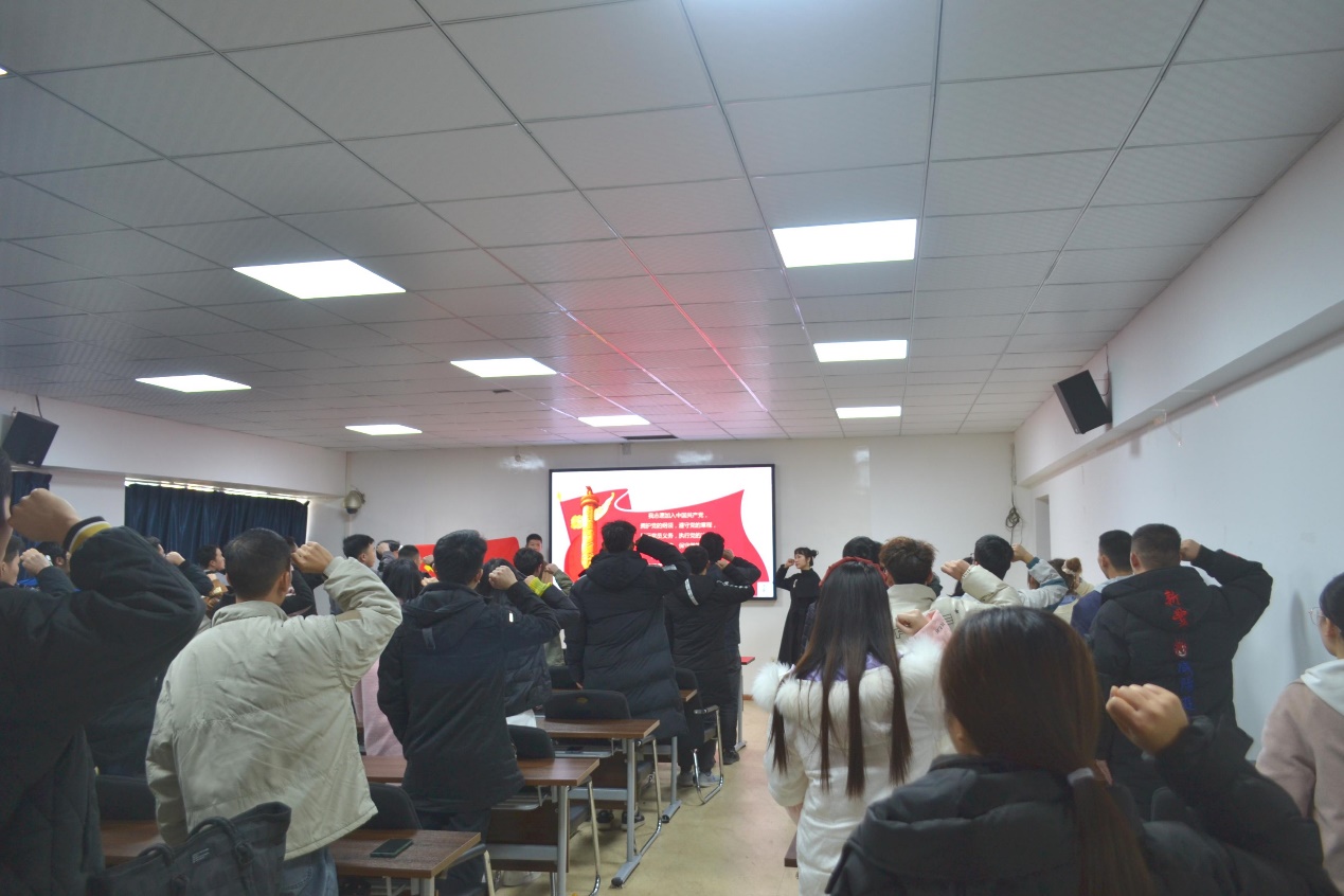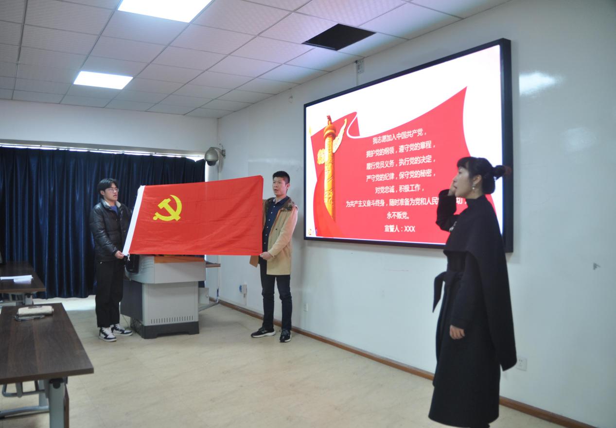 會議開始,新發(fā)展的預備黨員在廖燁的帶領下,莊嚴地舉起右拳,面向黨旗鄭重宣誓。