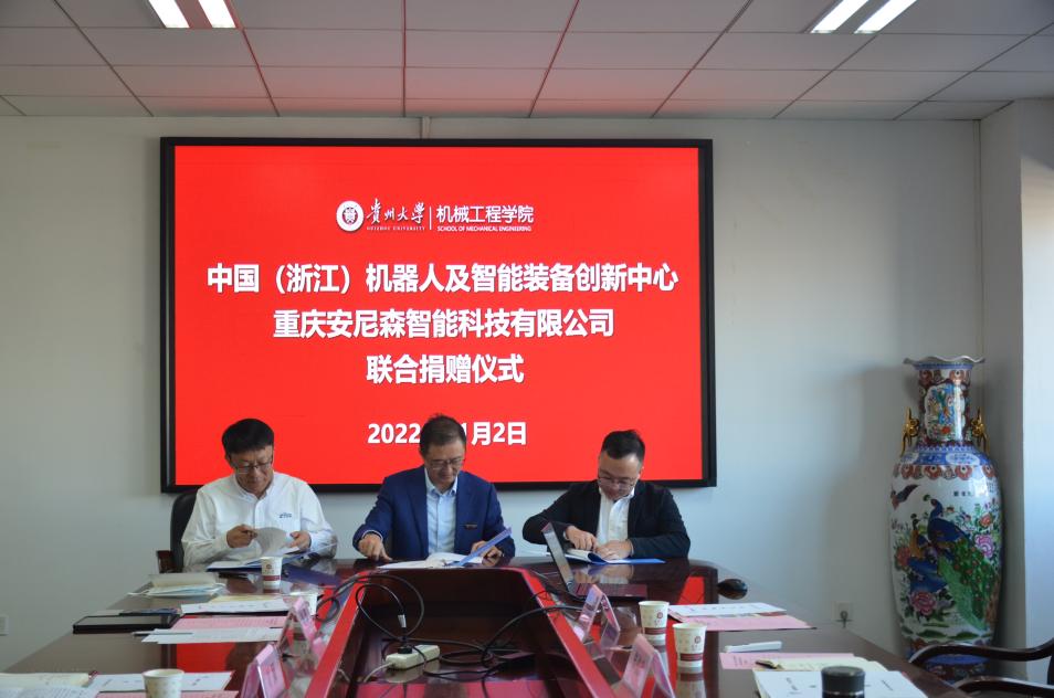2022年11月2日上午10時,貴州大學(xué)機(jī)械工程學(xué)院與中國(浙江)機(jī)器人及智能裝備創(chuàng)新中心重慶安尼森智能科技有限公司在機(jī)械樓518會議室舉辦了聯(lián)合捐贈儀式。中國(浙江)機(jī)器人及智能裝備創(chuàng)新中心鄭俊輝,重慶安尼森智能科技有限公司張能國,貴州大學(xué)教育發(fā)展基金會代表對外合作處處長劉穎,機(jī)械學(xué)院黨委書記滕召華,機(jī)械學(xué)院院長趙津,機(jī)械學(xué)院副院長何鋒,原機(jī)械學(xué)院學(xué)院黨委書記管琪明及專業(yè)系主任參加了捐贈儀式。