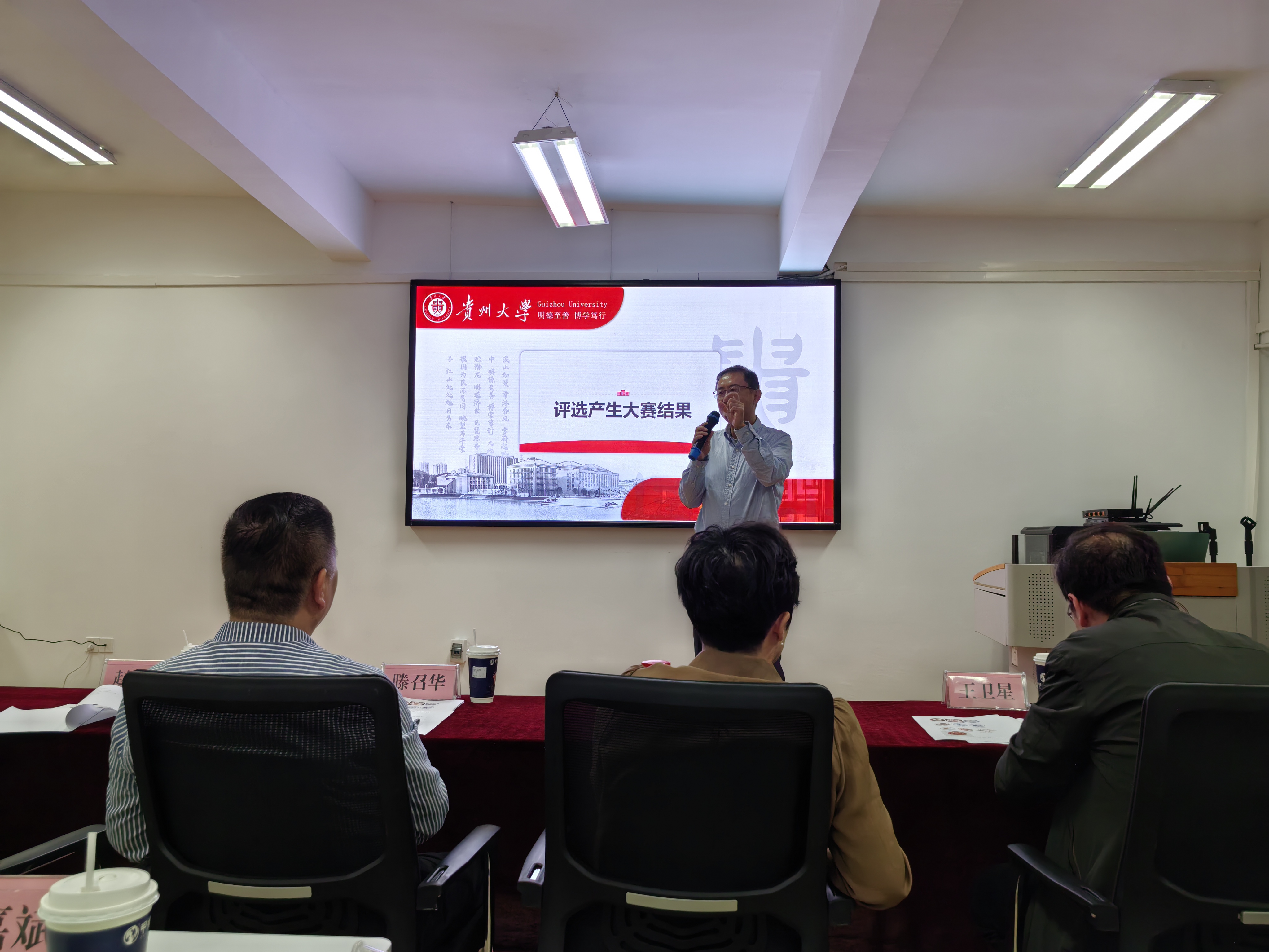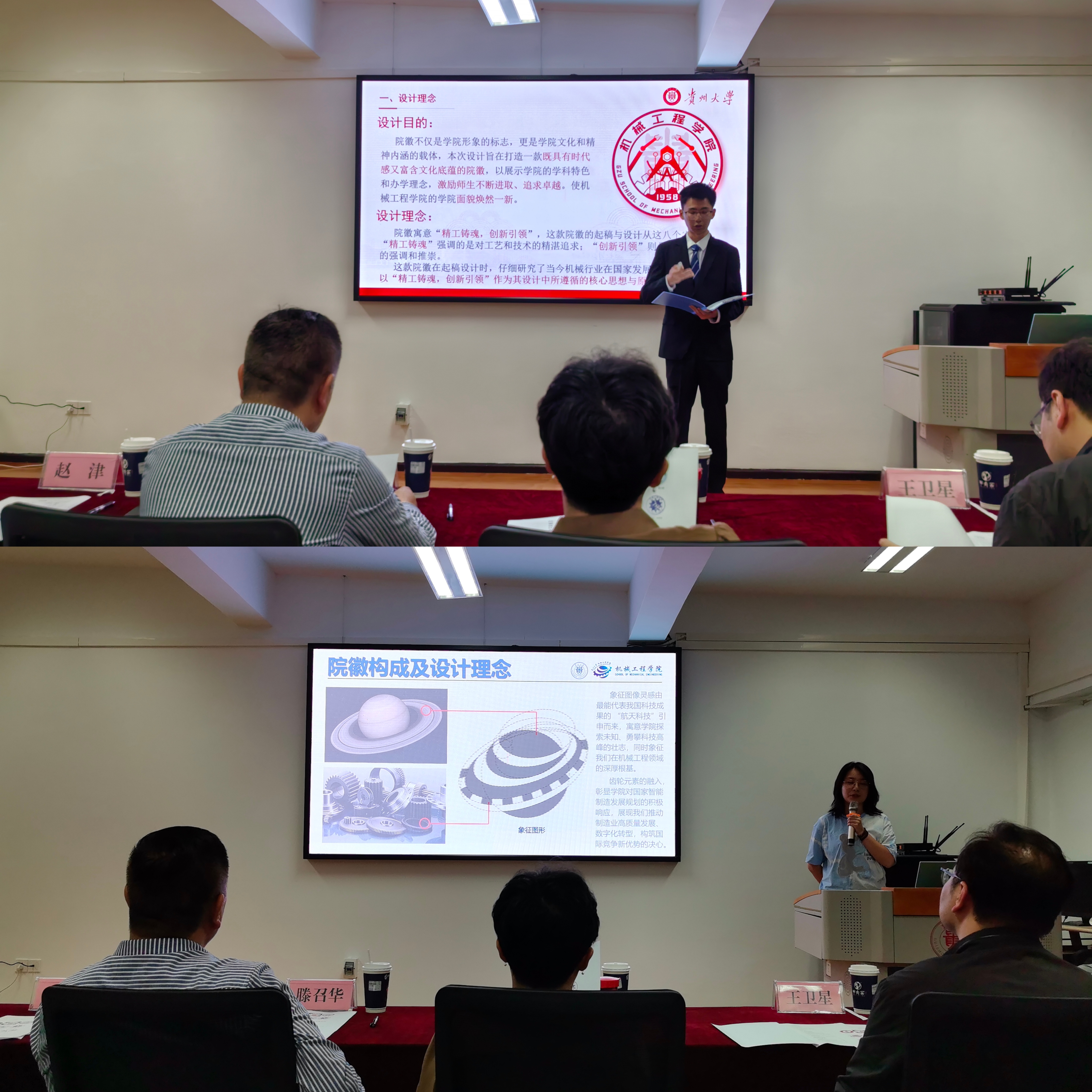 經(jīng)過初評、師生投票,進入決賽的10個院徽作品創(chuàng)作者依次展示他們獨特的設(shè)計理念和創(chuàng)意,評委依次打分。