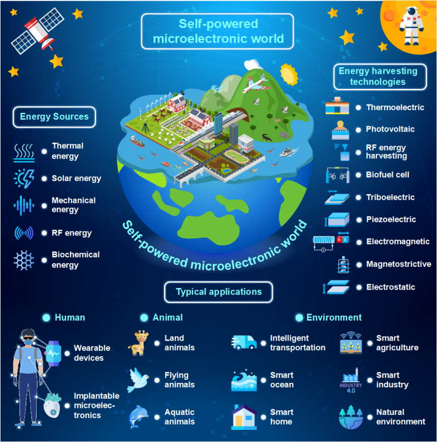 人工智能和物聯(lián)網(wǎng)正在推動基于自供電技術(shù)的微電子器件的快速發(fā)展,深刻影響著世界的發(fā)展進(jìn)程。本文全面回顧了自供電微電子領(lǐng)域的最新進(jìn)展、挑戰(zhàn)和未來發(fā)展方向。綜述了人體可穿戴設(shè)備、動物可穿戴設(shè)備和環(huán)境監(jiān)測傳感器的總體研究進(jìn)展。此外,本文還詳細(xì)概述了可用于自供電微電子的環(huán)境微能源類別,以及能量收集技術(shù)的原理和特征。從應(yīng)用角度出發(fā),全面總結(jié)了自供電微電子技術(shù)在人體可穿戴設(shè)備(眼鏡、助聽器、口罩、背包、手表、腕帶、手套、外骨骼系統(tǒng)、鞋襪)、動物可穿戴設(shè)備(陸地、飛行、水生)、環(huán)境監(jiān)測傳感(智能交通、智能海洋、智能家居、智能農(nóng)業(yè)、智能工業(yè)、以及自然環(huán)境監(jiān)測)。最后,針對自供電微電子器件的不足,提出了該領(lǐng)域的研究空白和未來的研究方向。