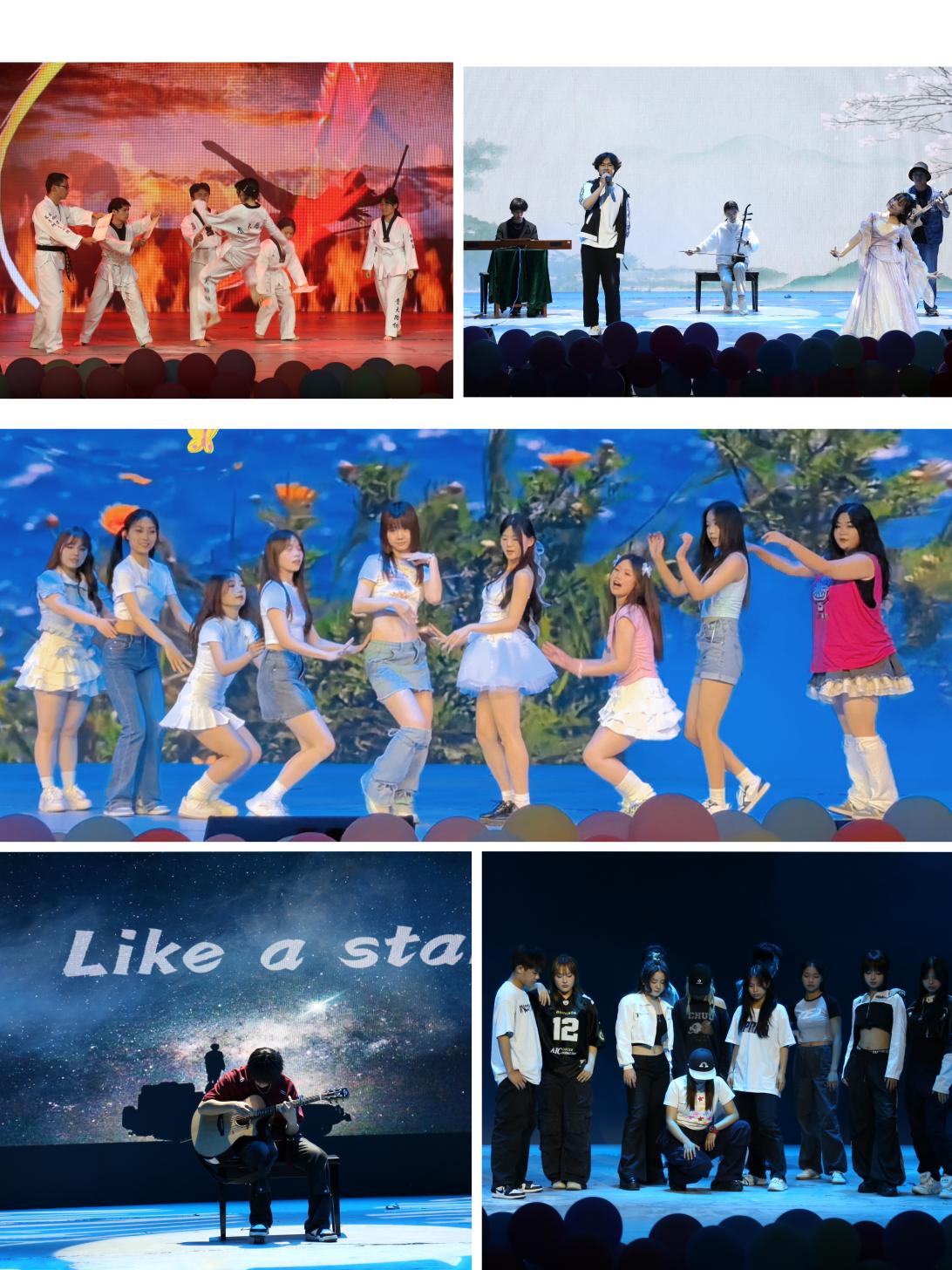 互動環(huán)節(jié)結(jié)束后,來到第二篇章《成長》,由各學生社團帶來精彩表演,舞蹈《STAY THIS WAY》激情澎湃,跆拳道表演《炫動青春》身姿矯健有力,樂器合奏《蘭亭序》悠揚婉轉(zhuǎn),舞蹈《RISING》盡顯風采,吉他指彈《LIKE A STAR》憑借高超的技術(shù)獲得全場喝彩。
