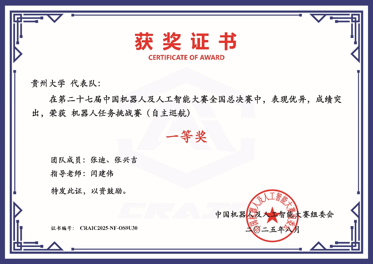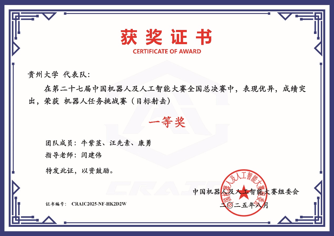 機械工程學(xué)院各參賽隊伍成員和指導(dǎo)老師經(jīng)歷了長達半年多的辛苦備賽,經(jīng)過校、省、全國總決賽層層選拔和激烈角逐最終在2025年8月3日到8月22日舉行的第27屆CRAIC中國機器人及人工智能大賽全國總決賽中取得國賽一等獎3項、國賽二等獎8項、國賽三等獎3項,再創(chuàng)貴州大學(xué)參加該比賽國賽一等獎數(shù)量和獲獎總數(shù)的歷史新高。值得一提的是微型無人機賽道今年是首次參賽,由管彥銀擔(dān)任隊長的貴州大學(xué)小芯藝藝代表隊奪得貴州大學(xué)在此賽道中的首個國賽一等獎的好成績。